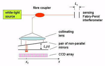 例如,干涉儀由兩個(gè)非平行的鏡子組成,以透射方式工作??梢钥闯?,氣隙Lr(x)取決于沿鏡子的位置x,并且在位置x0處產(chǎn)生最大干涉信號(hào),其中Lr(x0)與傳感干涉儀的間隙Ls精確匹配。該位置x0很容易由安裝在鏡子后面的CCD陣列確定。
