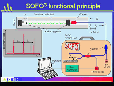 它基于與點(diǎn)光傳感器部分所述相同的白光干涉測(cè)量基本原理以上。來自白光源的光通過光纖傳輸?shù)焦鈱W(xué)傳感器。這里的傳感器由一個(gè)光纖耦合器組成,該光纖耦合器分成兩根不同長(zhǎng)度的光纖,每端都有一個(gè)微型鏡子。參考該配置作為Mach-Zehnder或傳感干涉儀。入射光脈沖由耦合器分成兩個(gè)脈沖,并且在返回時(shí),兩個(gè)脈沖在時(shí)間上分開t = 2nLs / c,其中n表示玻璃纖維的折射率,Ls 表示纖維的長(zhǎng)度差異和c光速。一根光纖連接到被測(cè)結(jié)構(gòu)上,而另一根光纖非常接近但沒有連接。結(jié)構(gòu)的變形導(dǎo)致路徑差2nLs 的變化。在這種情況下,它通過使用掃描移動(dòng)設(shè)備來測(cè)量