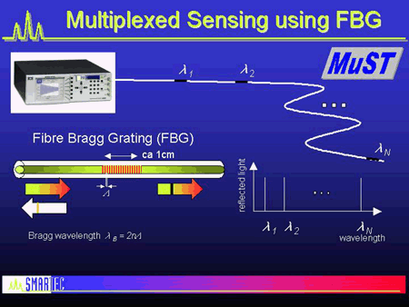 準(zhǔn)分布式或多路復(fù)用傳感器:被測(cè)量沿著單根光纖在許多固定的離散點(diǎn)處確定光纜。最常見的例子是多路復(fù)用FBG。