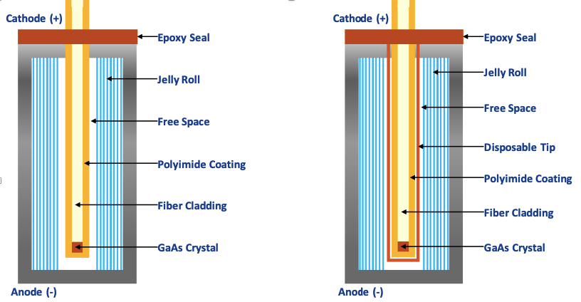 光纖溫度傳感器可以在單元形成階段或之后安裝。與在制造的電池芯上安裝傳感器相比,在電池形成階段安裝傳感器很簡(jiǎn)單。下面的圖1顯示了如何將光纖溫度傳感器安裝到圓柱形電池芯中的詳細(xì)視圖。