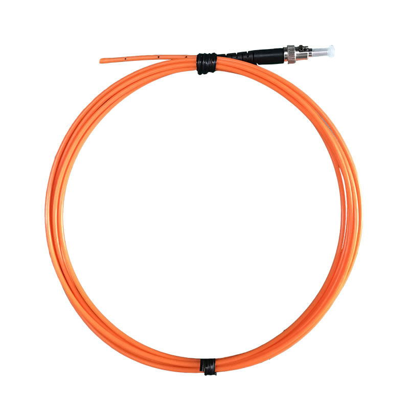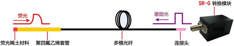 光纖探頭由ST接頭、光纖光纜、末端感溫端三部分組成。ST接頭是與光電模塊的連接部分;光纖光纜為傳光部分,內(nèi)部為石英光纖,石英光纖外部有涂覆層和包層,最外部為特氟龍保護(hù)套;末端感溫端含有感溫稀土材料,用于產(chǎn)生含有溫度信息的光信號;光纖整體耐200℃高溫,外表直徑為3mm。長期彎曲半徑13.2cm。短期彎曲半徑4.4cm。光纖引出線對地距離為0.4m的情況下,耐受工頻電壓100KV,持續(xù)時間5min。