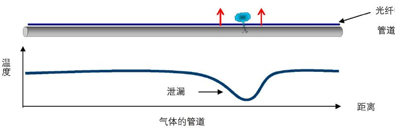 油氣管道泄漏時(shí)會(huì)引起泄漏點(diǎn)周?chē)鷾囟鹊淖兓?,通過(guò)分布式光纖溫度傳感系統(tǒng)可以準(zhǔn)確定位泄漏點(diǎn)。在天然氣管線介質(zhì)泄漏受壓情況下,氣態(tài)物質(zhì)導(dǎo)致的泄漏點(diǎn)的低溫,是由物質(zhì)的物理性質(zhì)、工藝條件和周?chē)h(huán)境所決定的。這些點(diǎn)的溫度異??赏ㄟ^(guò)分布式溫度測(cè)量而獲得,并有很好的溫度、距離和反應(yīng)時(shí)間精度。管道本身發(fā)生泄漏事故時(shí),泄漏出的天然氣由于存在壓力,會(huì)向管道周?chē)l(fā)出噴射狀的氣體。如果能對(duì)整條天然氣管道在現(xiàn)有的壓力、流量探測(cè)技術(shù)基礎(chǔ)上,利用沿管道敷設(shè)的通訊光纜,接入分布式光纖測(cè)溫傳感主機(jī),就能夠?qū)崟r(shí)探測(cè)到泄漏點(diǎn),并進(jìn)行泄漏點(diǎn)的定位和報(bào)警顯示。