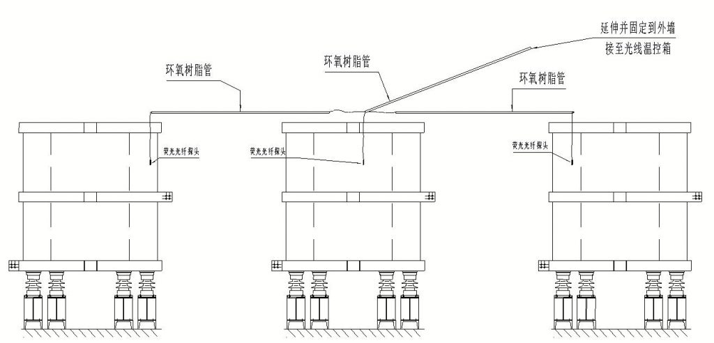 熒光式光纖測溫終端嵌入安裝在箱體,引出的光纖往墻體上部走,高度需要超過電抗器高度,經過安裝在墻壁的環(huán)氧樹脂管,三根光纖匯總進入B相電抗器;B相光纖直接安裝在電抗器內部氣道壁內;A、C兩相分別經過架空絕緣的環(huán)氧樹脂管引致A相、C相電抗器,安裝在電抗器內部氣道壁內。